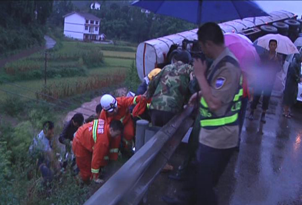 消防官兵到達(dá)現(xiàn)場,一輛油罐車撞破高速護(hù)欄橫在半空,車內(nèi)兩名人員已掉入護(hù)欄下面橋下,上下高度有5米之高,在得知兩人并無生命危險后,消防官兵決定前往前方50米處的另一起交通事故進(jìn)行處置,1人被困駕駛室內(nèi),無法動彈,在對現(xiàn)場進(jìn)行偵查后,消防官兵利用液壓剪、擴(kuò)張器、頂桿等救援工具冒雨實(shí)施救援,10分鐘后,被困人員被成功救出。消防官兵來不及歇息,立即前往后方50米處的高速護(hù)欄下面,對油罐車受傷人員進(jìn)行施救,由于護(hù)欄與下面地面非常陡峭,雨一直下,造成地面濕滑,一不小心將會從再次滑入山下,圍觀的過往司機(jī)朋友看見此次情況,也加入了救援行動中,15分鐘后,在經(jīng)過消防官兵與過往司機(jī)朋友的協(xié)助下成功將受傷男子抬上岸,并送上在場的120救護(hù)車,前往醫(yī)院救治。