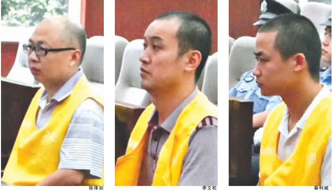 庭前,三被告申請不公開審理此案,被法院拒絕。9時(shí)40分許,徐澤如、李文松、秦科斌被帶到庭上,路過旁聽席時(shí),徐澤如將頭埋在胸前,疾步走過。