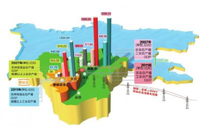 眼前是一幅涼山州和攀枝花的經(jīng)濟(jì)發(fā)展示意圖。除了各項經(jīng)濟(jì)指標(biāo)的高歌猛進(jìn),我們也看到了“西電東送”的重要工程錦蘇線,它們合成了對攀西城市群的最好詮釋:資源富集、投資熱土……