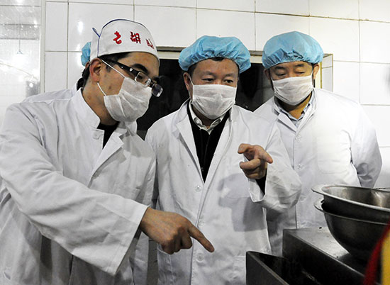 會后,周先毅、李楊俊一行還先后前往位于蛟龍工業(yè)港的成都古月食品有限公司、四川新華電腦學校食堂,就食品安全工作進行了突擊檢查。在成都古月食品有限公司,周先毅走進生產(chǎn)車間,一邊實地查看食品生產(chǎn)加工情況,一邊詳細詢問企業(yè)的原材料進貨渠道、調(diào)料存放、衛(wèi)生安全操作流程等方面的情況。在生產(chǎn)車間,當發(fā)現(xiàn)該公司在餐廚廢水沒有及時排放,周先毅當即要求企業(yè)負責人立即整改,并要求相關部門要加大督查力度,確保食品放心安全。