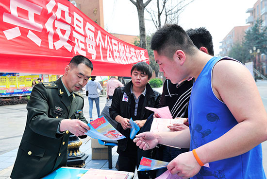 在該校學(xué)生活動中心前的宣傳點上,縣征兵辦負責(zé)人向來往學(xué)生發(fā)放宣傳資料,并為前來咨詢的學(xué)生就征集對象范圍、入伍基本條件、征集辦法、大學(xué)生入伍優(yōu)惠政策、士兵服役期間優(yōu)待政策、退役士兵就業(yè)安置政策等做了詳盡地介紹!皼]想到上了大學(xué),還能有機會去實現(xiàn)自己的軍營夢!鼻皝碜稍兊拇蠖䦟W(xué)生小劉說,通過咨詢,自己更堅定了參軍的決心。