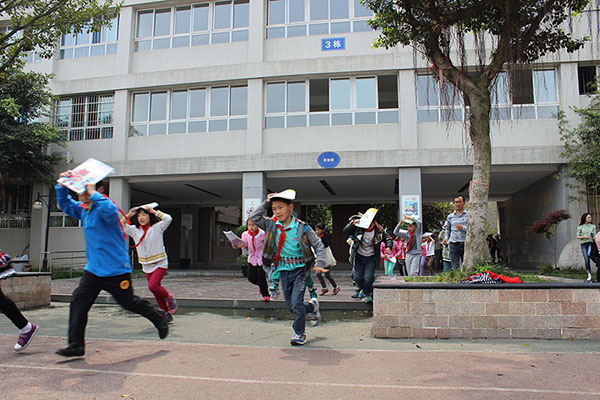 演習時,設定震情為龍門山發(fā)生6級地震,該校具有38秒的預警時間。啟動演習后,學校的廣播系統(tǒng)自動開啟,38秒倒計時隨即在全校響起。位于一樓的學生立即有秩序的撤離教室;位于二樓的學生聽見預警時間大于20秒,立即有序撤離教室。三樓及以上的師生就近避險,等待代表地震結束的預警警報結束后再有序快速疏散,撤離教學樓。