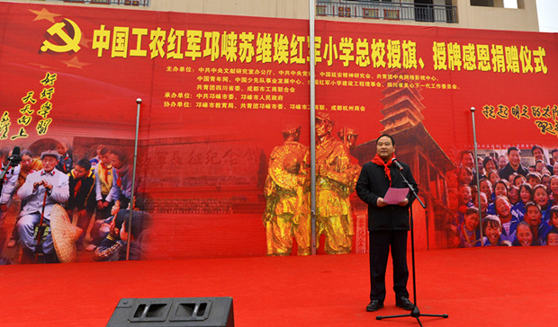據(jù)介紹,“紅軍小學建設工程”是我國老一輩革命家和紅軍后代發(fā)起的一項公益行動。這一行動將在中國工農紅軍戰(zhàn)斗過的地方和貧困地區(qū)共建設100所“紅軍小學”,幫助革命老區(qū)改善辦學條件,讓老區(qū)孩子接受學校教育,傳承紅軍精神。據(jù)了解,1935年11月,西征南下紅四方面軍兵分三路,從蘆山、雅安方向進入邛崍,在石塔、太和等地建立區(qū)、鄉(xiāng)、村蘇維埃政權,開展了擴軍、備戰(zhàn)、籌糧等工作,播下了革命的火種。1936年,紅軍戰(zhàn)略轉移,千余名邛崍兒女又隨軍北上抗日,絕大多數(shù)都犧牲在抗日戰(zhàn)爭和解放戰(zhàn)爭的戰(zhàn)場上,為中國革命的勝利作出了不朽的貢獻!
