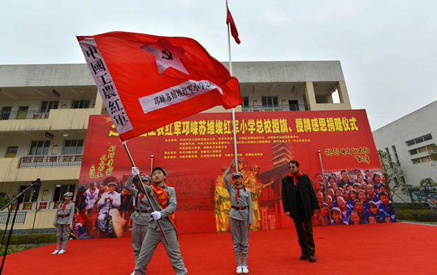 央廣網(wǎng)邛崍2月23日消息(周光偉 記者隆敏 馬鮮)2月22日,在紅色文化濃郁的邛崍市高何九年制學校內,數(shù)百名學生身穿統(tǒng)一的紅軍服,佩戴著鮮艷的紅領巾,臉上洋溢著幸福的微笑。今天,全國紅軍小學建設工程理事會等機構在這里舉行邛崍?zhí)K維埃紅軍小學總校和分校旗授牌捐贈儀式,邛崍市高何小學非常榮幸地成為全國百所紅軍小學的一員,邛崍另有10所學校被批準為分校,分享著這份殊榮。朱德元帥外孫劉建,陳毅元帥之子陳昊蘇等紅軍后代參加儀式。