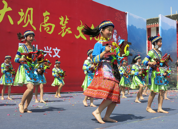 據(jù)介紹,“大壩高裝”自清朝雍正十四年(公元1736年)問世以來(lái),已有近300年的悠久歷史,是大壩鯢鄉(xiāng)人民喜聞樂見的一種民間傳統(tǒng)藝術(shù)。幾百年來(lái),它既豐富了大壩人民的文化生活,又有力促進(jìn)了地方經(jīng)濟(jì)的繁榮和發(fā)展,推進(jìn)了大壩與周邊地區(qū)的文化物資交流。2008年,神秘壯觀的“大壩高裝”被國(guó)務(wù)院批準(zhǔn)為國(guó)家級(jí)非物質(zhì)文化遺產(chǎn),并在當(dāng)年第七屆中國(guó)民間藝術(shù)節(jié)上榮獲“山花獎(jiǎng)”銀獎(jiǎng),大壩苗族鄉(xiāng)也被文化部授予“中國(guó)民間文化藝術(shù)之鄉(xiāng)”的稱號(hào)。