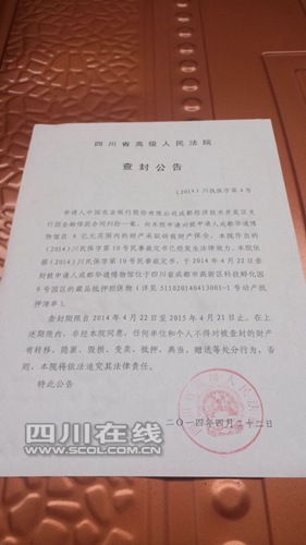 大門門底用大鐵鏈封鎖,門上貼了10張公告:由四川省高級(jí)人民法院、成都市中級(jí)人民法院出具的《查封公告》。公告上顯示查封期限為1年,期限分別是從2014年4月22日至2015年4月21日、2015年4月29日不等,出具時(shí)間分別為2014年4月22日和4月30日。