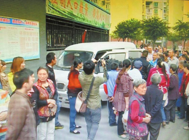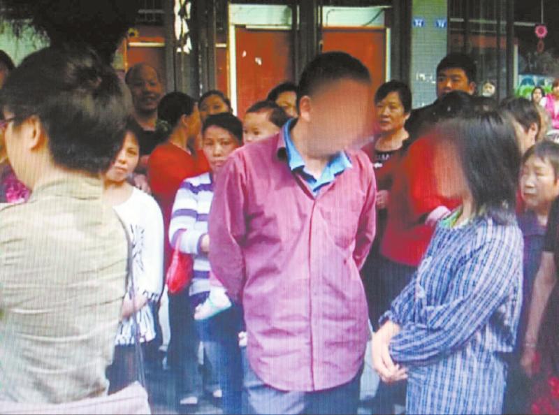 蔡先生(左,身穿紅色襯衫)在人群中等候單位領(lǐng)導(dǎo)前來說明情況。(視頻截圖)