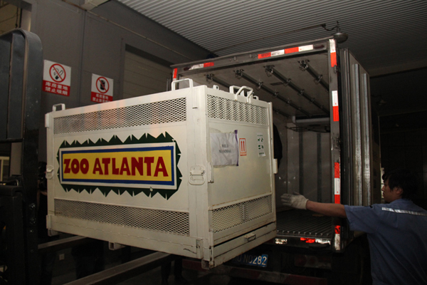 凌晨1:20分左右,大熊貓喜蘭和阿寶乘坐的航班順利降落在成都雙流國際機(jī)場。早已等候多時的工作人員,用叉車將這兩只回國的寶貝轉(zhuǎn)運(yùn)到專門的運(yùn)輸車輛上。第一次踏上故土的喜蘭和阿寶,好奇的不住四處張望。也許由于長途跋涉回來,這對海歸兄弟也微微流露出一絲絲倦意,不一會就安靜的趴在鐵籠里。