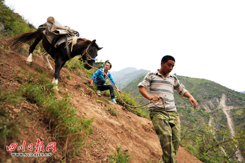 崎嶇的山路不能通車,馬是唯一的交通工具,道路有時窄的只能讓一人通行,馬劍霞爬到山上讓