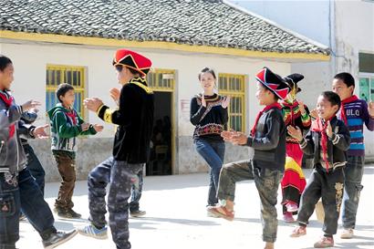 安金波雙眼望著的地方,是學(xué)校操場(chǎng),馬劍霞穿著彝族背心,與孩子們手拉著手在小操場(chǎng)上跳民族舞。上一堂課,她在教三年級(jí)的語(yǔ)文,下一堂課,可能會(huì)講六年級(jí)的數(shù)學(xué)。