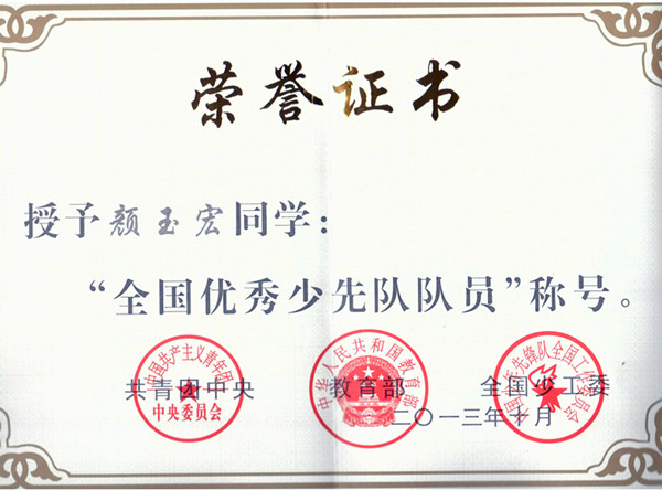 為充分展現(xiàn)當(dāng)代少先隊(duì)員的精神風(fēng)貌和先進(jìn)事跡,發(fā)揮優(yōu)秀典型的示范帶動(dòng)作用,激勵(lì)廣大少先隊(duì)員向先進(jìn)典型學(xué)習(xí),努力追求進(jìn)步,共青團(tuán)中央、教育部、全國(guó)少工委授予顏玉宏等297名少先隊(duì)員“全國(guó)優(yōu)秀少先隊(duì)員”稱(chēng)號(hào),其中四川省12名少先隊(duì)員入圍,宜賓僅顏玉宏1人高票當(dāng)選。同時(shí),宜賓縣柏溪鎮(zhèn)育才路小學(xué)少先隊(duì)大隊(duì)、翠屏區(qū)人民路小學(xué)六(5)“夢(mèng)想”中隊(duì)分別被授予全國(guó)優(yōu)秀少先隊(duì)大隊(duì)、少先隊(duì)中隊(duì)稱(chēng)號(hào)。