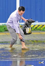 市民李先生要到馬路對(duì)面的單位上班,為了渡過(guò)突然出現(xiàn)的“小河”,他干脆脫下鞋襪,赤腳渡“河”。