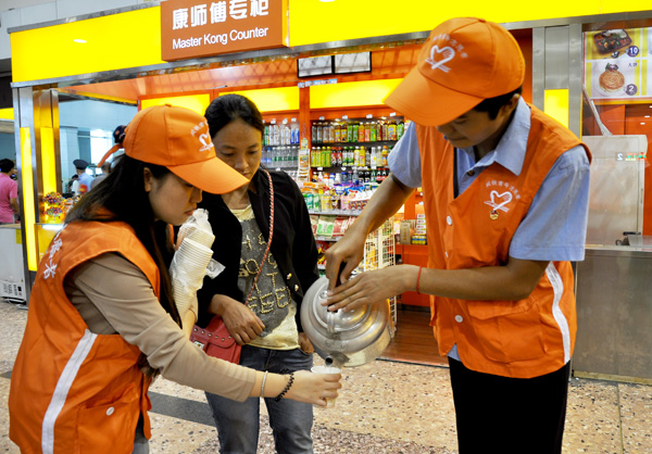 青年志愿者在成都站第一候車室為棉農(nóng)倒開水。欒曉文攝
