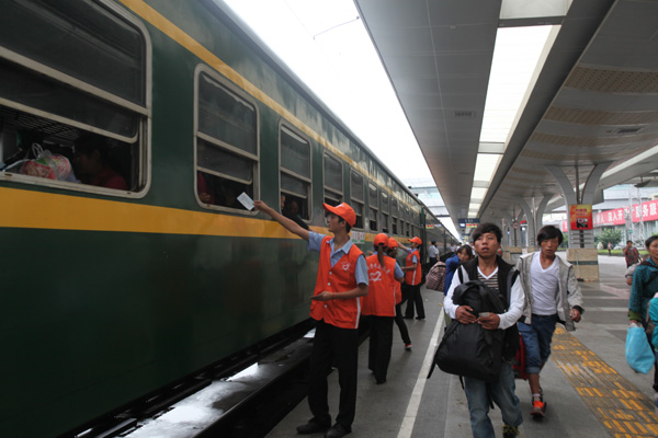 圖3:成都鐵路局自愿者們正在為旅客發(fā)放“棉農(nóng)直通卡”。胡志強攝