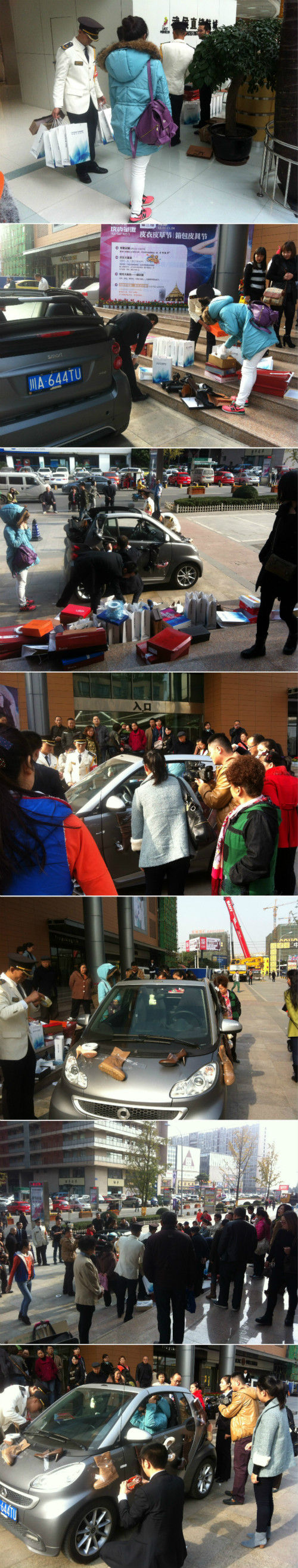 雖然“雙11”已過(guò)去幾天了,但它給大家?guī)?lái)的購(gòu)物狂歡效應(yīng)仍在持續(xù)。26歲成都女孩王媛,因不滿男友“雙11”禁止她網(wǎng)購(gòu),于是15日中午來(lái)到武侯直銷鞋城,一口氣花了2萬(wàn)多元,買下了100雙各式各樣的鞋子泄憤。不僅如此,為了炫耀自己的“戰(zhàn)績(jī)”,她還讓工作人員將買來(lái)的鞋子,一雙一雙粘到自己的smart轎車上,然后駕車離去。