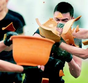 阿壩特警拳開陶盆,展示硬氣功。