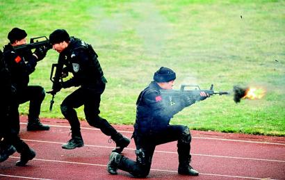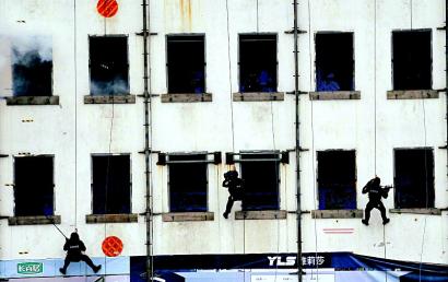 3名特警隊員從商場外10層樓的高空索降,撞碎窗戶玻璃,“呯、呯……”一陣激烈的槍聲過后,劫持人質(zhì)的“恐怖分子”全被擊斃,被劫人質(zhì)獲得解救。這是11月14日舉行的“全省公安機關(guān)特巡警暨應(yīng)急處突預(yù)備隊合成演練”中的一幕。