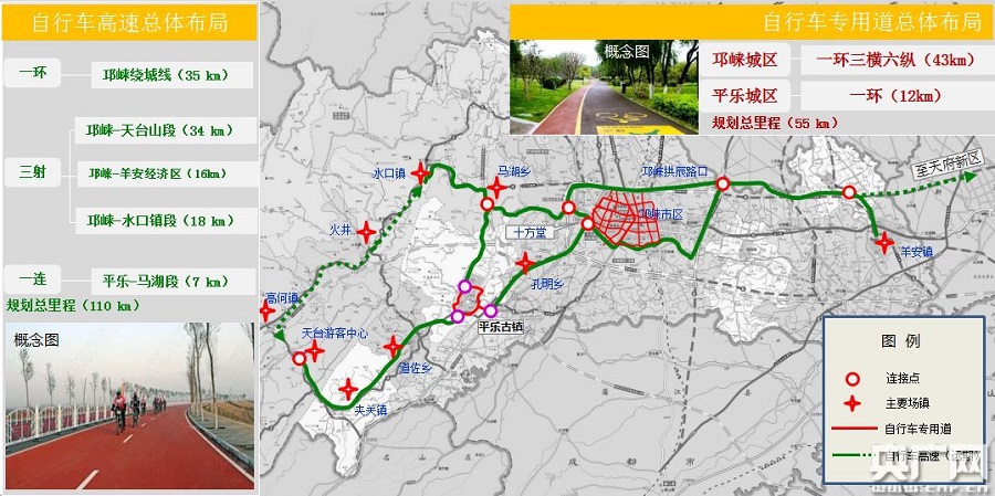 按照規(guī)劃,邛崍自行車生態(tài)旅游高速公路的總體布局為一環(huán)三射一連,其中,一環(huán)設(shè)計(jì)為邛崍繞城線,起于拱辰紅綠燈處,向西沿規(guī)劃的邛崍繞城環(huán)線走向,連通白鶴山景區(qū),止于拱辰紅綠燈,共計(jì)35公里;三射設(shè)計(jì)為邛崍至天臺(tái)山,起于黃壩大橋十方堂,沿十方堂至孔明至平樂旅游公路走向布線,連接平樂繞場路規(guī)劃綠道,止于天臺(tái)山游客中心,共計(jì)約34公里;邛崍至羊安經(jīng)濟(jì)區(qū),起于邛崍繞城東北角落,沿規(guī)劃科學(xué)城西路布線,止于邛崍與新津交界對(duì)接天府新區(qū)慢行交通,共計(jì)約16公里;邛崍至水口鎮(zhèn),起于邛崍繞城西側(cè)白鶴山,沿現(xiàn)狀邛蘆路走向布線,止于水口鎮(zhèn),共計(jì)約18公里。