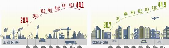 從瀘州到南充,從川南到川北,從安寧河谷到成都平原,在“兩化”互動、城鄉(xiāng)統(tǒng)籌發(fā)展戰(zhàn)略的指引下,全省城鎮(zhèn)與工業(yè)發(fā)展不協(xié)調(diào)的局面正在被改變,兩率間的差距開始逐步縮小。2012年,縮小為1.8個百分點,2013年,城鎮(zhèn)化率首次超越工業(yè)化率,從落后1.8個百分點到領(lǐng)先0.8個百分點,是過去10年來變化最大的一年。