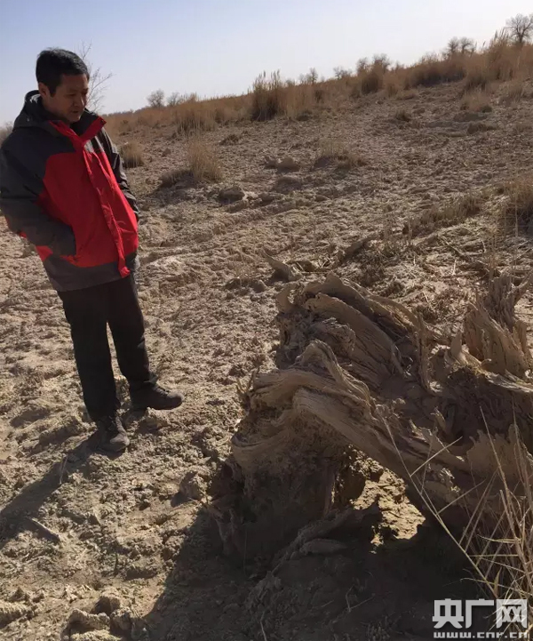 孫志成憂心忡忡看著已經(jīng)枯死的胡楊樹(中國之聲記者丁飛攝)