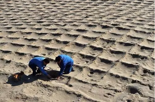 敦煌研究院保護(hù)所的兩名工作人員檢查用于固沙的麥草方格 圖自新華社