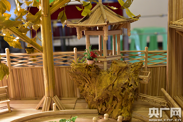 聽起來似乎很簡單,做起來就沒這么容易了。余航說,在制作的過程中,有許多的細(xì)節(jié)需要注意,每一個(gè)步驟都需要細(xì)心和耐心,其中,最讓余航記憶深刻的是制作屋頂?shù)摹褒垺毙脱b飾。“起初想著用木頭來雕,但覺得不協(xié)調(diào),后來還是選擇用竹筷進(jìn)行雕琢,感覺還是很成功。”