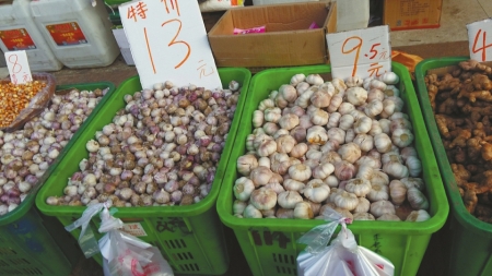 記者在其他菜市場發(fā)現(xiàn),10元一斤已是普通大蒜的最低零售價,而紫皮獨瓣蒜價格已經(jīng)漲到了13元一斤。在一家大型超市,記者發(fā)現(xiàn),普通大蒜價格為10.8元一斤,獨瓣蒜價格更是高達16元一斤。