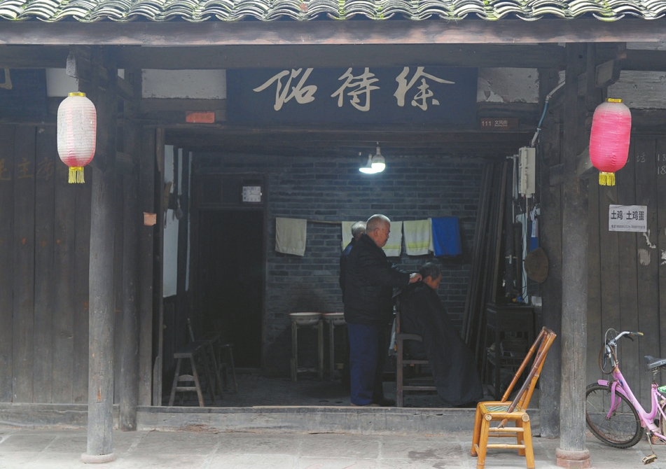 在這里,已經(jīng)75歲高齡的主人徐待詔徐定邦老人,依然堅(jiān)持著“土刀修面”的那一套傳統(tǒng)剃頭匠技藝,剃刀洗眼等川西獨(dú)有的理發(fā)技藝也能在這里找到。“‘徐待詔鋪’是西來古鎮(zhèn)上風(fēng)貌保存較為完整的川西民居,不僅保留了傳統(tǒng)川西場鎮(zhèn)前店后宅的平面布局,還在文風(fēng)街營業(yè)了40余年至今,對傳承民俗文化、民間匠人手藝具有重要作用。”成都市房管局相關(guān)負(fù)責(zé)人介紹道。