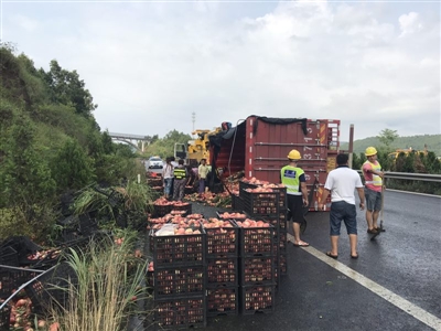 山西省永濟(jì)市的貨車司機(jī)晉軍平出門不順,7月16日早上,他從山西運(yùn)城拉往云南保山的9噸桃子,因?yàn)榉嚾鲈诹藦V元市境內(nèi)的高速路上!八懔,這些桃子不要了!睍x軍平不知所措。但現(xiàn)場處理事故的高速交警卻告訴他,“把好的桃子撿起來,這些桃子已經(jīng)賣掉了。”