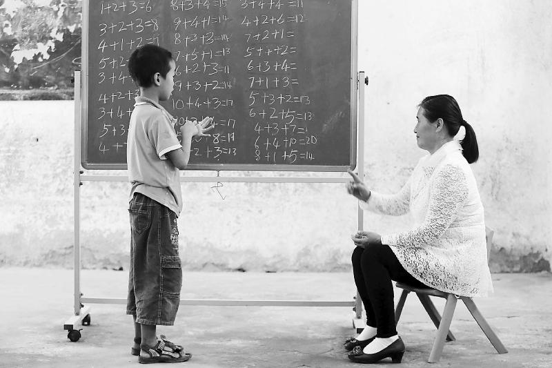 嚴(yán)云春老師在天仙鎮(zhèn)天仙學(xué)校雙廟教學(xué)點(diǎn)輔導(dǎo)孩子學(xué)數(shù)學(xué)。