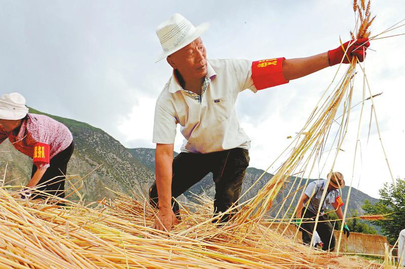6月25日,甘孜州鄉(xiāng)城縣尼斯鎮(zhèn)馬色村黨員服務(wù)隊成員為缺勞戶熱龔鄧珠家搶收麥子。這段時間尼斯鎮(zhèn)正在搶收麥子,該鎮(zhèn)158名黨員組成7支黨員服務(wù)隊走進7個行政村,幫助貧困戶、孤寡老人等缺勞戶開展義務(wù)服務(wù)。 本報記者李向雨攝