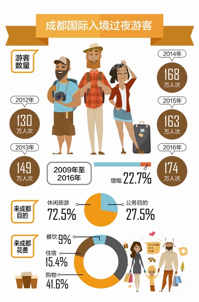 從這份指數(shù)中,不但可以見證成都國際入境過夜游客的飛速增長,還能發(fā)現(xiàn)一些老外來成都的特征。老外來成都,首要目的為休閑旅游,占比為72.5%,而出于公務目的的,為27.5%。不過,入境游客在成都花費并不高,2016年為6億美元,與大阪的34億美元相比有較大差距。