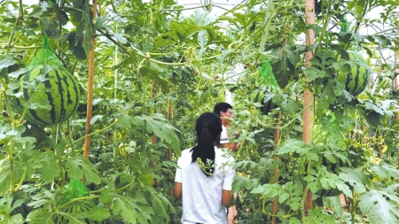 觀光客前來采摘西瓜。