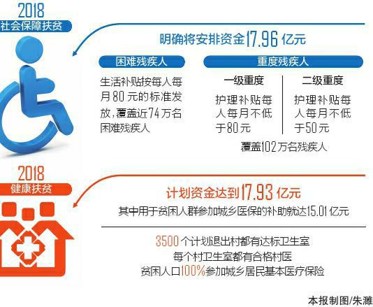 今年的社會保障扶貧專項方案強化幫扶力度,幫助特殊困難貧困家庭脫貧,明確將安排資金17.96億元,其中對困難殘疾人生活補貼在2017年每人每月70元的基礎(chǔ)上提高10元、按每人每月80元的標(biāo)準(zhǔn)發(fā)放,覆蓋近74萬名困難殘疾人;重度殘疾人護理補貼按一級重度殘疾人每人每月不低于80元、二級重度殘疾人每人每月不低于50元的標(biāo)準(zhǔn)發(fā)放,覆蓋102萬名殘疾人。