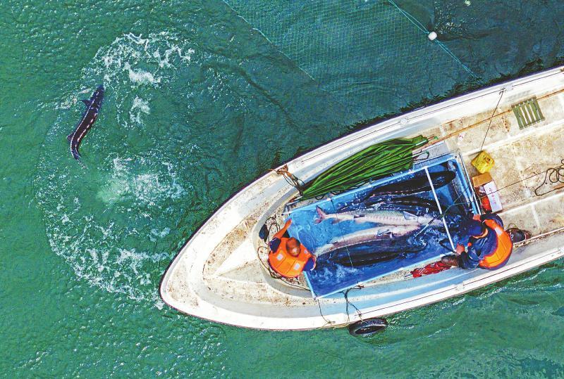 科研人員將長江鱘親魚放入產(chǎn)卵場中。