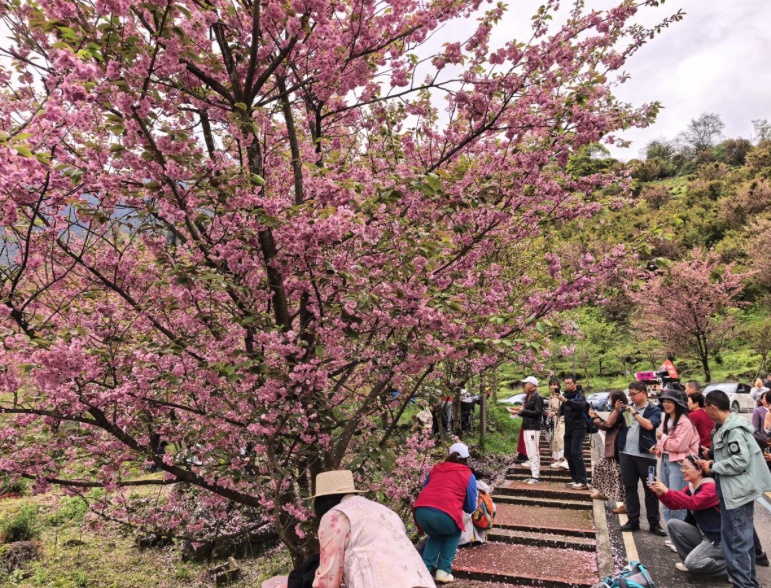 游客在櫻花樹下拍照打卡(汶川縣融媒體中心供圖)