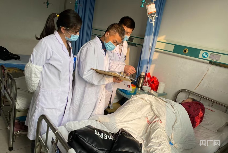 張海洋(左二)帶領(lǐng)醫(yī)護(hù)人員查房,細(xì)致詢問患者心血管健康狀況。(央廣網(wǎng)發(fā) 受訪者 供圖)