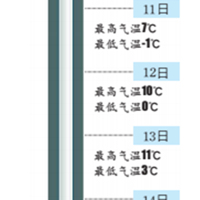 未來幾天天氣情況如下:8日白天局部地區(qū)有陣雪,北風2~3級逐漸增強到3~4級,清晨最低氣溫濟陽、商河-4℃左右,市區(qū)及其他縣區(qū)-2℃,最高氣溫2℃。8日夜間到9日多云轉晴,北風3~4級,最低氣溫濟陽、商河-9℃,市區(qū)及其他縣區(qū)-6℃左右,最高氣溫3℃。10日~11日晴間多云,北風轉南風都是2~3級,早晨氣溫較低,白天溫度回升。12日~14日晴,南風3級,氣溫逐步回升。