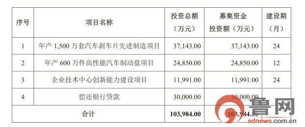 本次發(fā)行募集資金用于三大項(xiàng)目:年產(chǎn)1,500萬套汽車剎車片先進(jìn)制造項(xiàng)目、年產(chǎn)600萬件高性能汽車制動(dòng)盤項(xiàng)目、企業(yè)技術(shù)中心創(chuàng)新能力建設(shè)項(xiàng)目,另外還將償還30,000萬元銀行貸款。