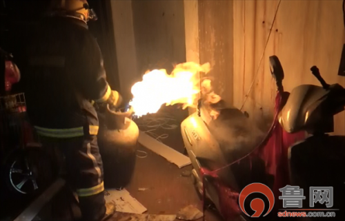 消防員將煤氣罐轉(zhuǎn)移至室內(nèi)空地