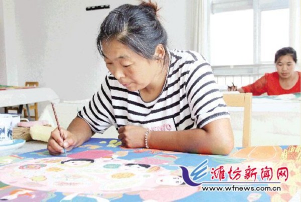 農村婦女馬玉萍在彌河鎮(zhèn)農民畫創(chuàng)作中心,為合作社創(chuàng)作訂單作品。