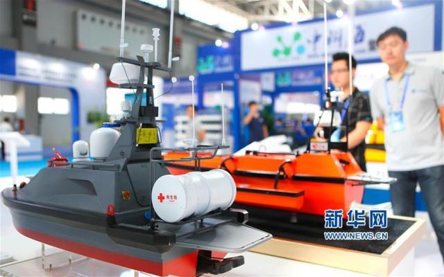 9月12日,觀眾在2017中國(青島)國際海洋科技展覽會上參觀珠海一家科技公司研發(fā)的海上搜救無人艇模型!