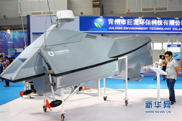 9月12日,觀眾在2017中國(青島)國際海洋科技展覽會上參觀珠海一家科技公司研發(fā)的海洋測量無人艇模型!