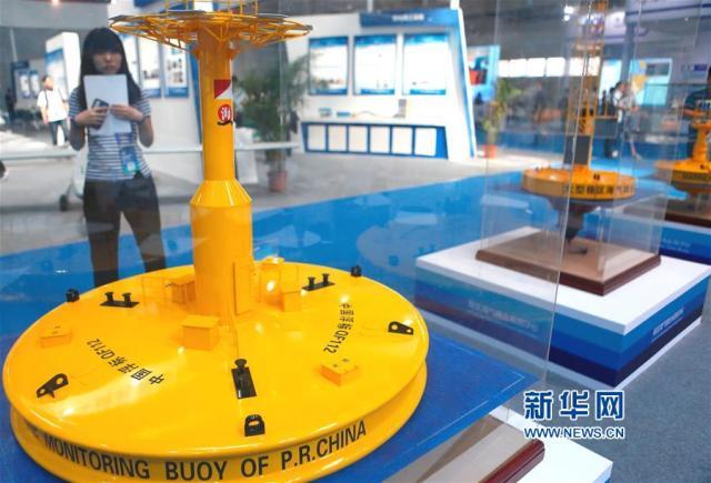 9月12日,觀眾在2017中國(青島)國際海洋科技展覽會上參觀山東科學(xué)院海洋儀器儀表研究所研發(fā)的海洋環(huán)境監(jiān)測浮標(biāo)模型。