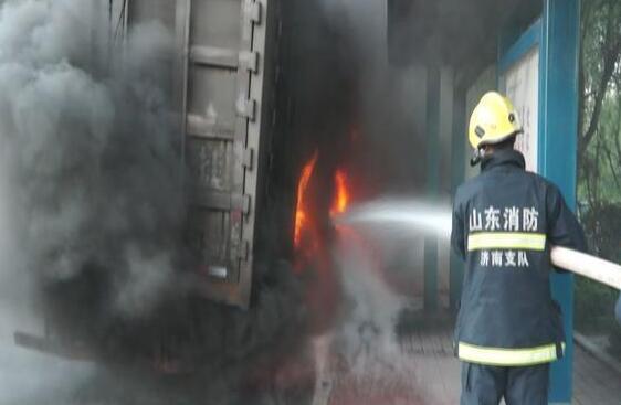9月14日清晨5點50分,濟南公安消防支隊濟鋼中隊接到群眾報警稱:在外國語學院門口,一輛半掛車輪胎著火!
