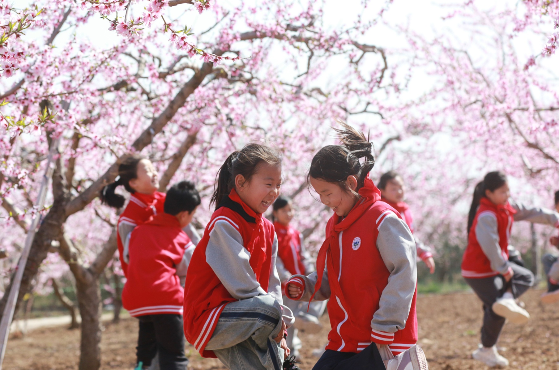 濰坊高密市東北鄉(xiāng)東流口子小學(xué)將課堂搬進繁花滿枝的桃林。