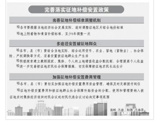 對于社會普遍關(guān)注的征地補償安置,《意見》也作出明確規(guī)定。在征地補償標(biāo)準(zhǔn)方面,各市要根據(jù)當(dāng)?shù)亟?jīng)濟社會發(fā)展實際,適時調(diào)整征地區(qū)片綜合地價標(biāo)準(zhǔn);地上附著物和青苗補償標(biāo)準(zhǔn),至少5年調(diào)整一次。關(guān)于被征地群眾的安置,各市、縣(市)要綜合運用貨幣、農(nóng)業(yè)、留地(留物業(yè))、社會保險、產(chǎn)權(quán)調(diào)換等方式,妥善安置被征地群眾生產(chǎn)生活;積極探索建立兼顧國家、集體、個人的土地增值收益分配機制,合理提高個人收益;進一步完善被征地農(nóng)民社會保障措施,切實保障被征地農(nóng)民長遠(yuǎn)生計。此外,加強征地補償安置費用管理,各市、縣(市)要切實加強征地補償安置費用資金管理,確保及時足額撥付到位;征地補償安置費用和被征地群眾社會保障補貼資金的分配、使用和管理要納入被征地農(nóng)村集體經(jīng)濟組織村民會議或村民代表會議討論決定事項范圍;被征地農(nóng)村集體經(jīng)濟組織要嚴(yán)格執(zhí)行村務(wù)公開、財務(wù)公開和民主理財制度,確保征地補償安置費用和被征地群眾社會保障補貼資金的分配、使用和管理合法合規(guī)、公平合理、公開透明。