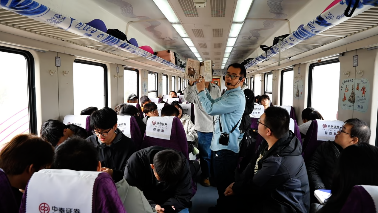 在列車上,學(xué)生們化身“文物主題講解員”“文物保護(hù)普法員”,開展“現(xiàn)場版”專業(yè)講解實(shí)踐比賽,向乘客宣講新修訂的《山東省文物保護(hù)條例》及文物保護(hù)背后的歷史故事。省旅行社協(xié)會(huì)還為優(yōu)秀學(xué)生頒發(fā)“最佳講解創(chuàng)意”證書,激勵(lì)學(xué)生們繼續(xù)主動(dòng)傳播齊魯文化,勇?lián)嗄晡奈锶瞬胖厝巍?/p>