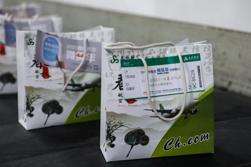這是春秋航空舉辦的“微笑年”驚喜行李活動(dòng),在現(xiàn)場(chǎng)工作人員的引導(dǎo)下,旅客拿起了這份特別的禮物,打開袋子一探究竟。扇子,毛巾、搪瓷杯、微笑口罩、行李綁帶,各式各樣的夏日防暑和實(shí)用小禮品一應(yīng)俱全。袋子里都是春秋航空專門為旅客朋友們精心定制的夏日禮物。