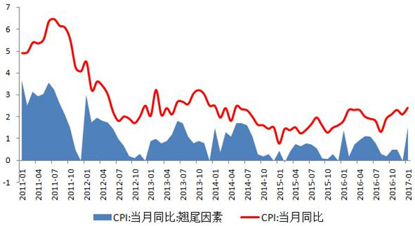 2017年1月中旬生豬出場價(jià)低位反彈上漲至18元/公斤,由于生豬出場價(jià)依然較低,玉米批發(fā)價(jià)處于1.76元/公斤的低水平,豬肉價(jià)格上漲壓力不大。生豬存欄量降至3.67億頭的低位,能繁母豬總量也在下降,農(nóng)產(chǎn)品價(jià)格上升帶動(dòng)豬糧價(jià)格上升,豬肉價(jià)格可能在2017年二季度迎來上行周期。但豬周期的波動(dòng)性明顯平緩,預(yù)計(jì)豬肉價(jià)格上漲的幅度不會(huì)達(dá)到上一輪那么高。非食品價(jià)格有所上漲,工業(yè)生產(chǎn)消費(fèi)品價(jià)格漲勢明顯,原油類相關(guān)消費(fèi)品價(jià)格上升,服務(wù)類價(jià)格平穩(wěn)上漲,居住類價(jià)格漲幅較小。大宗商品價(jià)格回升,工業(yè)領(lǐng)域產(chǎn)品價(jià)格加速上漲,并逐漸傳導(dǎo)至消費(fèi)端,帶動(dòng)剔除食品、能源以外的核心CPI持續(xù)上漲。從核心CPI運(yùn)行來看,物價(jià)仍處緩慢上行周期。經(jīng)濟(jì)運(yùn)行緩中趨穩(wěn),經(jīng)濟(jì)增長難以明顯回升,在供求狀況沒有明顯改善的情況下,PPI向CPI的傳導(dǎo)并不暢通;堅(jiān)持穩(wěn)健中性的貨幣政策基調(diào),調(diào)節(jié)好貨幣閘門,有助于貨幣投放平穩(wěn)與流動(dòng)性整體穩(wěn)定。預(yù)計(jì)物價(jià)運(yùn)行整體溫和,整體水平可能略有上漲,應(yīng)關(guān)注核心CPI上升帶來的通脹壓力。